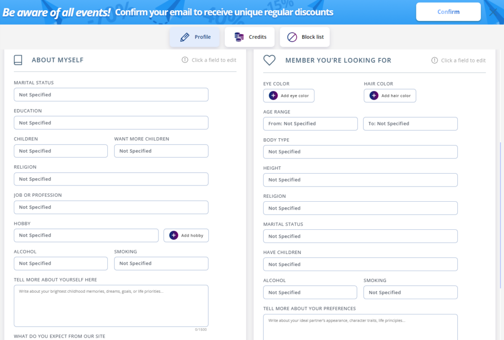 After the registration, your profile will be empty. The best mail order bride sites like SofiaDate offer a lot of options for you to customize it—there are more than 20 fields you can fill here, both the ones about yourself and the ones about your perfect match.